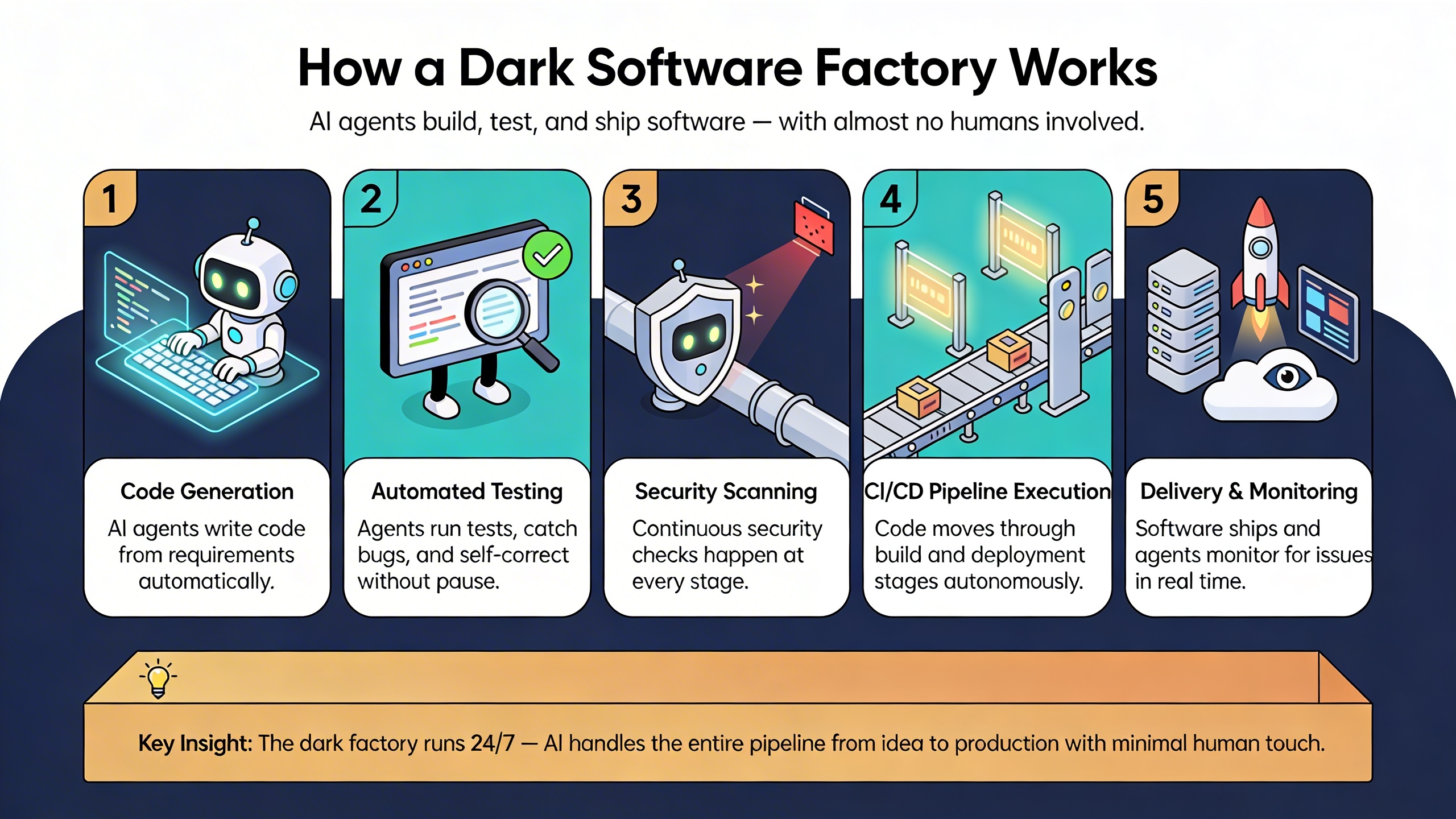 Dark software factories describe a new model of software delivery in which AI agents handle most of the implementation work. They break down tasks, generate code, run tests, validate outcomes and prepare releases with minimal direct coding by humans. The idea comes from automated manufacturing, where production continues without people on the factory floor. In software, the lights are not literally off, but the workflow changes in a similar way. Humans define intent, constraints and quality thresholds, while agents execute the bulk of the delivery process.