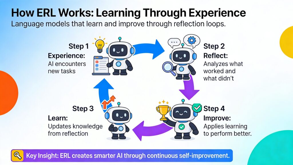 In the context of AI, ERL embeds an explicit experience–reflection–consolidation loop inside the reinforcement learning process. Instead of just optimizing for a score, the model is trained to analyze its own behavior. It transforms raw, binary feedback (pass/fail) into rich, linguistic reasoning signals.